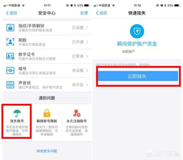 方式3:用亲朋好友的手机,登陆我们的支付宝账户,依次选择【设置】【安全中心】【挂失账号】,选择【立即挂失】,如下图所示▼。