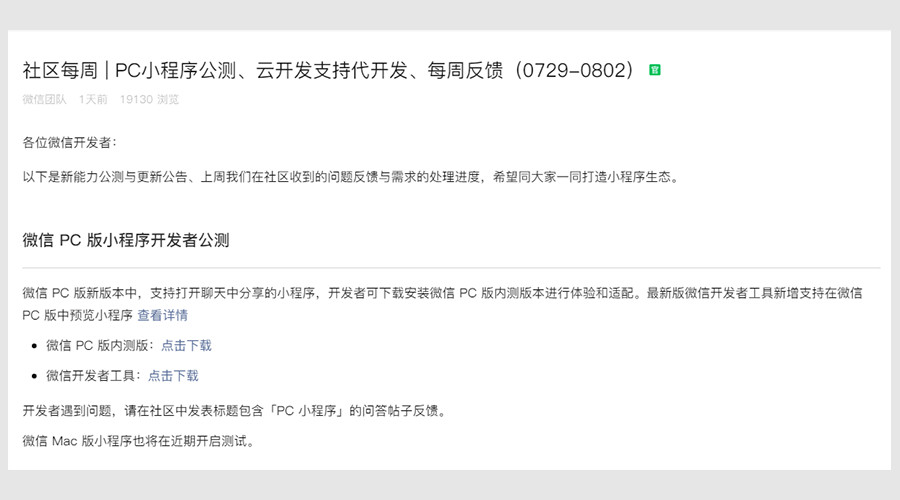 2019年8月9日,微信开发者社区出现了一则公告,如下图: