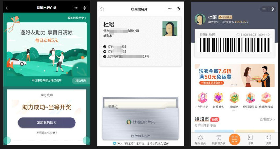 如图分别是滴滴、递名片、和便利蜂三个小程序。