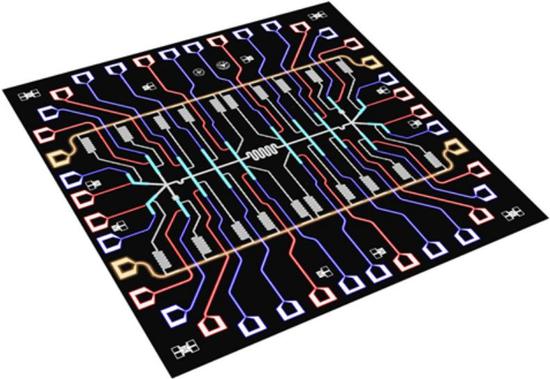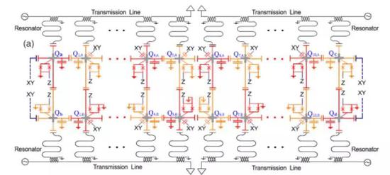 这种芯片架构,20 个超导量子比特如图一样呈现两排平行的排列。与电脑的架构类似,在芯片中间采用了一条总线(Bus)作为所有量子比特相互连接的途径。而每一个量子比特又有自己的控制端口(如图中所示的红线和蓝线)。也就是说,每一个量子比特都能独立编程、读写以及检测,而总线的设计又将这些量子比特联系在了一起,实现全局纠缠。