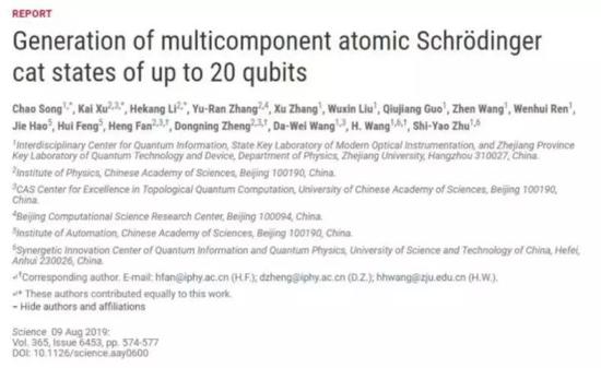 浙江大学为主的研究团队虽然也是开发并使用高量子比特的量子芯片,但是他们有新的亮点。研究团队的成员来自浙江大学、中科院物理所、中科院自动化所、北京计算科学研究中心等研究机构,他们通力合作开发出具有 20 个超导量子比特的量子芯片,虽然量子比特数没有达到 24,但是该芯片成功操控其实现全局纠缠,刷新了固态量子器件中生成纠缠态的量子比特数目的世界纪录。实验成果以文章的形式发表于 Science 杂志上。