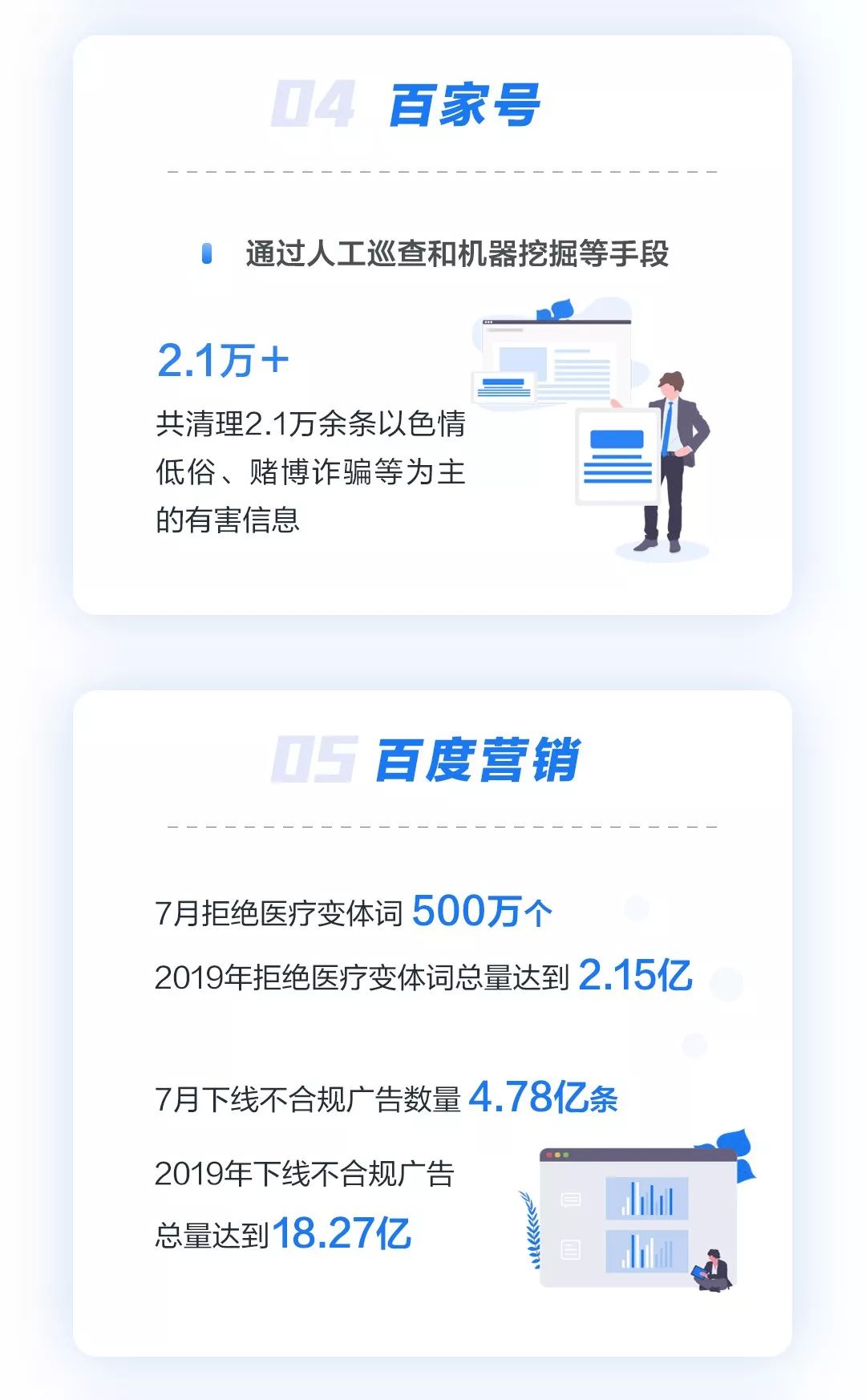 在网络营销方面,百度7月下线不合规广告4.78亿条,拒绝医疗变体词500万个。2019年至今,百度下线不合规广告总量已达18.27亿,拒绝医疗变体词总量达2.15亿。