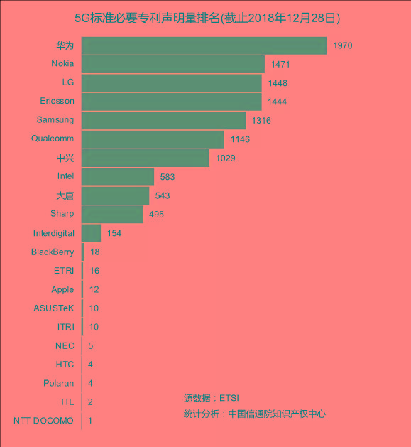 在这份榜单中,作为即将到来的5G时代领先者,华为获得科技创新综合实力第一实至名归。据此前华为公布的数据显示,截至2018年底,华为累计获得授权专利87805项,其中5G标准必要专利声明量为1970项,排名世界第一。
