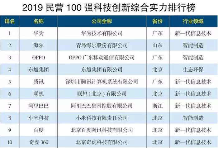 近日,权威网站发布了2019国内民营企业100强科技创新综合实力排行榜,华为、海尔、OPPO荣登榜单前三位。