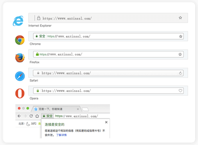 安信SSL证书的Symantec、Geotrust、Comodo、Thawte以及RapidSSL等多家全球权威CA机构的SSL数字证书,浏览器的兼容性达到99.99%,所有的主流浏览器和设备均能支持。