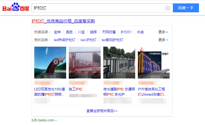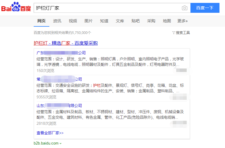 除了上面提到的产品搜索以外,用户在百度首页进行厂家搜索时,会直接看到百度爱采购精选厂家板块在搜索结果第一页展示,这里都是相关的优质厂家聚合展示,点击就能进入商家店铺页面。举例来说在百度搜索“护栏灯厂家”,就可以看到一个标题为“护栏灯厂家_精选厂家_百度爱采购”的聚合卡片,卡片上有多家相关厂家的信息展示,包括公司名称和经营范围,浏览次数等。