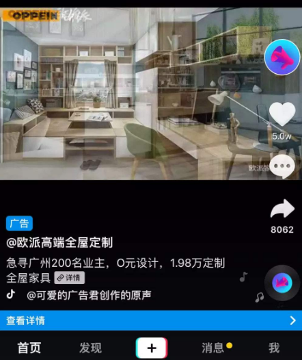 账号:广告主无抖音账号,无主页,不可关注。支持点赞,但不统计不显示点赞数量,不支持评论和转发