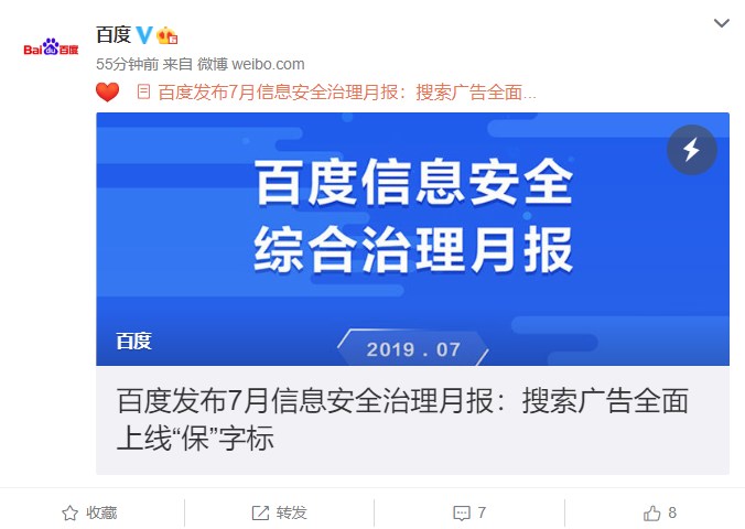 IT之家8月15日消息 今天,百度发布7月信息安全治理月报,月报称百度7月下线不合规广告4.78亿条,拒绝医疗变体词500万个,PC 端搜索广告也全面上线“保”字标识。