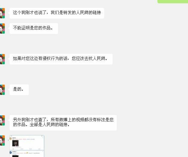 原创小组对此事试图与无授权搬运的平台沟通,对方却表示:旗下账号所转载的视频链接来源于人民网,并没有证据证明视频的原创者是谁,如果存在侵权,应该去找人民网。其潜台词是否可以这样理解:我们并没有侵权,我们只是跟随人民网做好心的信息传播者。