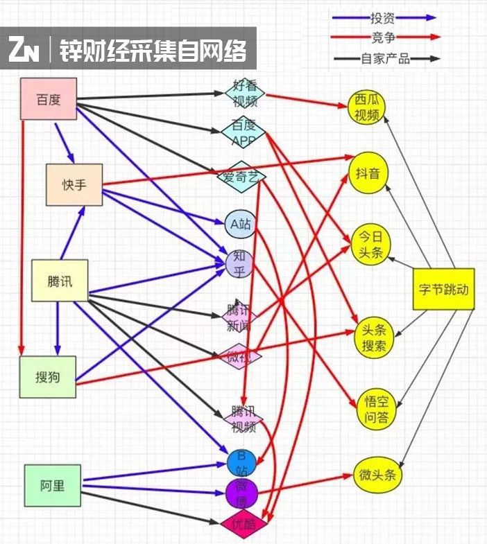 图为BAT与字节跳动的流量分布图谱,以及相互竞争的主要产品