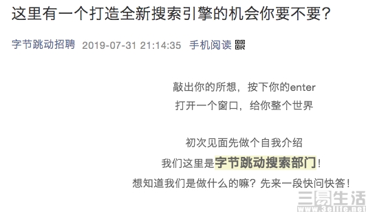 7月31日,今日头条母公司字节跳动的微信公众号中发出了一封招聘启事,突然成为了外界关注的焦点。究其原因,则是因为此次招聘的不是与新闻或推荐算法有关的人员,而是为了组建一个“搜索引擎”研发团队,并且其中的诸多细节还有意无意透露着,这个搜索引擎将会是针对移动端打造。