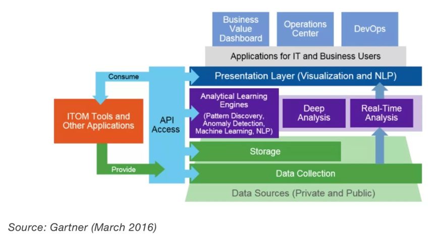 Gartner在2016年第一次提出AIOps概念时,AI代表了Algorithmic(算法),算法的基石正是海量的数据,在2017年将AI含义改为Artificial Intelligence(人工智能)后,同样需要海量的数据进行处理和学习。我们从下文的Gartner描绘的AIOps平台架构中同样能看到数据对于AIOps、对于运维、对于监控的重要性。
