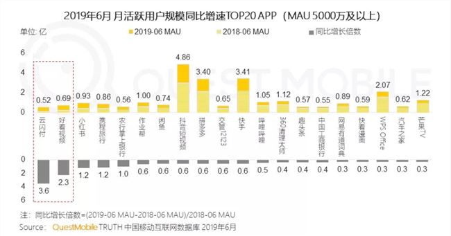 站长之家(ChinaZ.com) 8月14日 消息:今天,QuestMobile发布了《 2019 移动互联网半年增长报告》。报告显示, 2019 年 6 月,月活 5000 万及以上App中,好看视频背靠百度系APP的引流,用户规模增长2. 3 倍,增速排名第二。银联云闪付则凭借大量线下推广以及补贴,用户量暴增3. 6 倍。