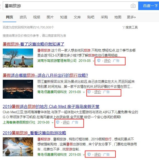8月13日,百度发布旅游保障升级计划,推出四大举措。用户全网搜索旅游相关关键词时,会在搜索结果中的广告内容出现蓝色的盾牌型“保”字标识。用百度APP搜索“旅游”、“自由行”等旅游相关核心高频关键词,在搜索结果顶部,有相应的风险提示。百度引入了第三方机构中华人民调解委员会,当用户在旅游等各个领域遭遇纠纷时,可以帮助用户通过线上线下联合的方式进行维权。此外,百度还通过AI技术,对旅游广告和自然搜索结果进行清查。