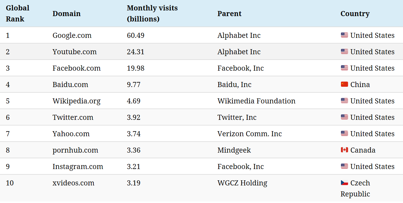 今日,知名财经网站 VisualCapitalist 发布了2019年全球流量网站榜单。