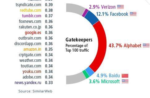 在前100名流量的百分比中,Alphabet(谷歌母公司)贡献了43.7%,Facebook(脸书)占12.1%,Baidu(百度)占4.9%,接着是Microsoft(微软)跟 Verizon(威瑞森)。