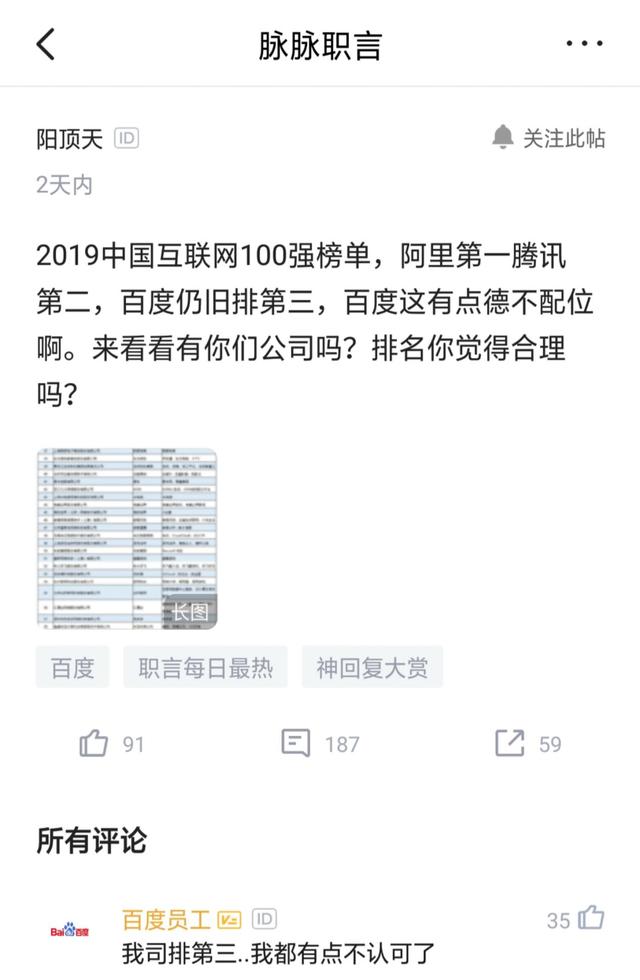昨天中国互联网企业100强公布,阿里、腾讯无可争议位居前二,但仍旧排第三的百度却被不少网友诟病德不配位。外界对百度的不看好,已经到了相当严重的地步。
