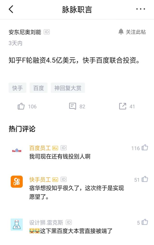 前两天,一向以精英社区自诩的知乎拿到了总额为4.32亿美元的F轮融资,这也是知乎迄今为止最大的一轮融资。不过有趣的是,这轮融资居然是快手领投、百度跟投。