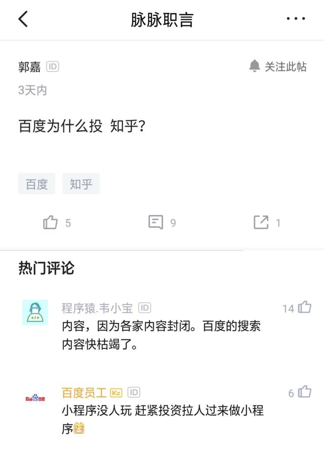 有脉脉用户表示,其实最根本的原因,还是百度看重知乎的内容。两者同为内容社区产品,百度想要借此机会接入知乎的智能小程序,引入知乎上大量的高质量问答,提高搜索内容源的丰富性,从而满足用户的需求。
