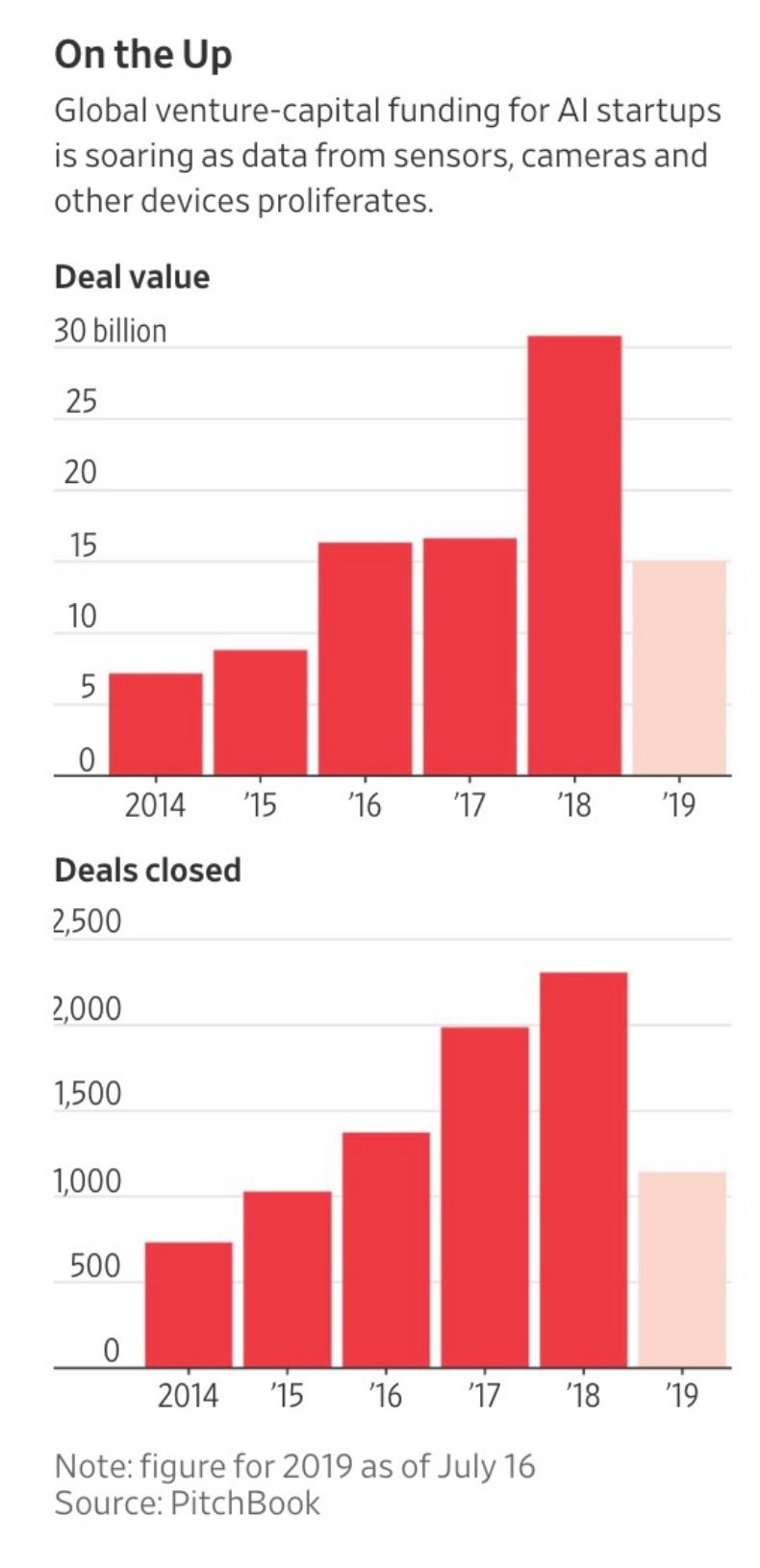 图|PitchBook 提供近几年 AI 技术投融资金额比较(来源:WSJ)