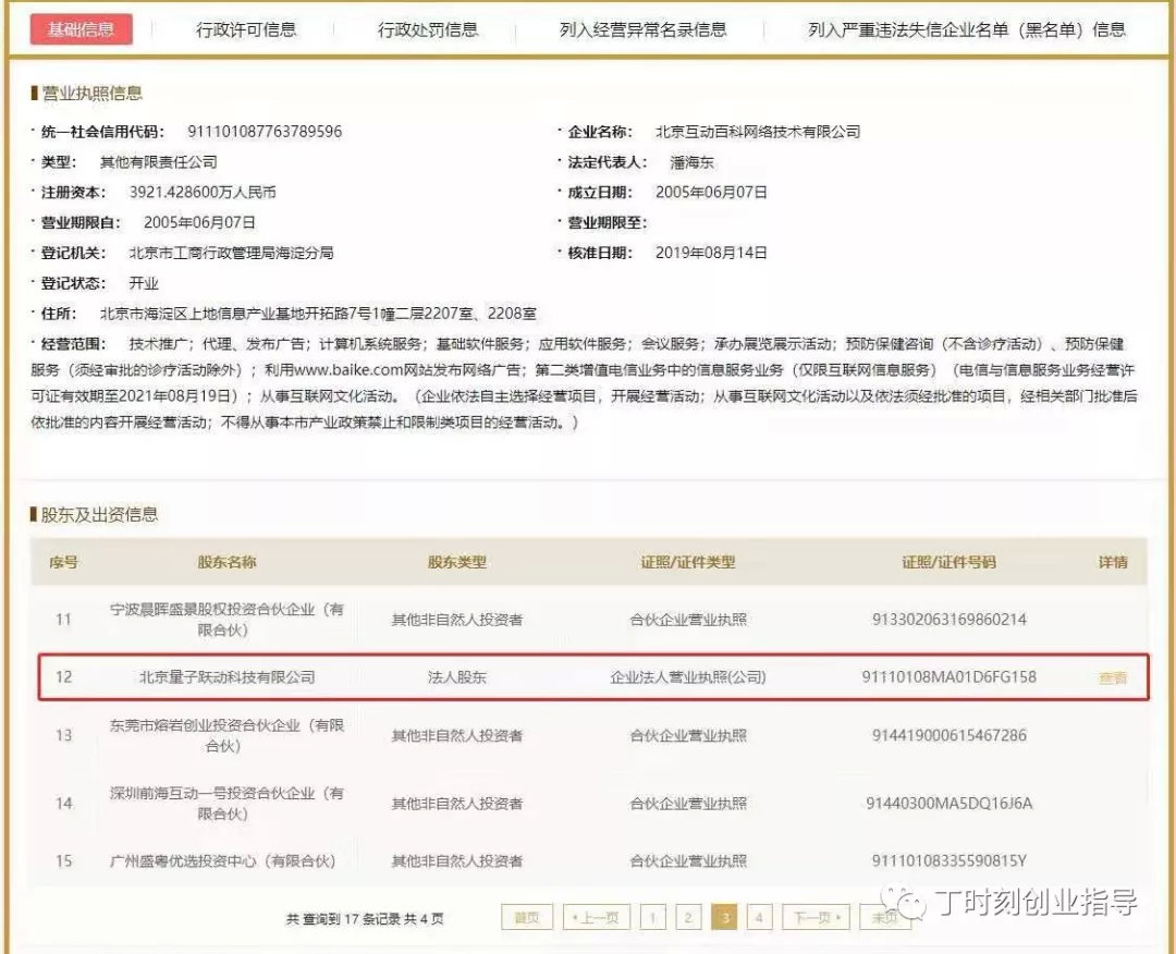资料显示,2019年3月1日,量子跃动入股互动百科所属公司北京互动百科网络技术股份有限公司,出资额871.4286万元,持股比例22.22%,一跃成为第一大股东。