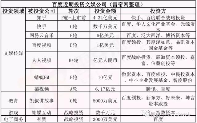 当前,百度已经投了快手,凯叔讲故事、网易云音乐、百度视频、蝴蝶互动、人人视频、蜻蜓FM,最近更是大手笔的联手快手投资了知乎。