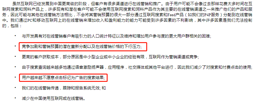 在最新的年报中百度也提到,百度在线营销广告业务面临的不确定性风险越来越大。