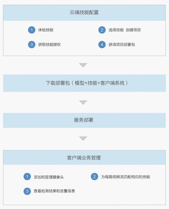 百度智能视频监控开发平台目前上线了安全帽佩戴合规检测、漏发检测、工服着装合规检测、烟火检测、陌生人识别、吸烟识别、打手机识别、课堂整体专注度分析以及学生个体专注度分析等9个预置AI技能。开发者可选择相关AI技能,下载技能部署包,并在本地服务器上进行部署,在部署后得到的系统中进行摄像头管理,完成整套业务的交付。如果需要更多的业务功能,只需调用此系统中的数据接口进行二次开发与适配,即可实现与自有系统的对接和个性化开发。