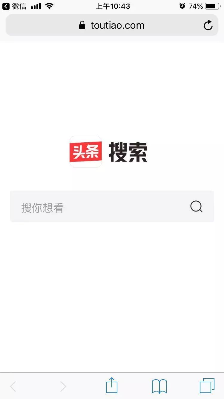 整个首页只有一个Logo和一个搜索框,搜索框上展示出头条搜索的宣传语:「搜你想搜的」,喔不,现在是「搜你想看」,风格简约,有点类似Google界面,不多一丝一毫的缀饰。