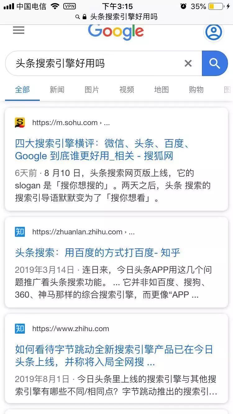 谷歌搜索「头条搜索引擎好用吗?/怎么样」搜索结果