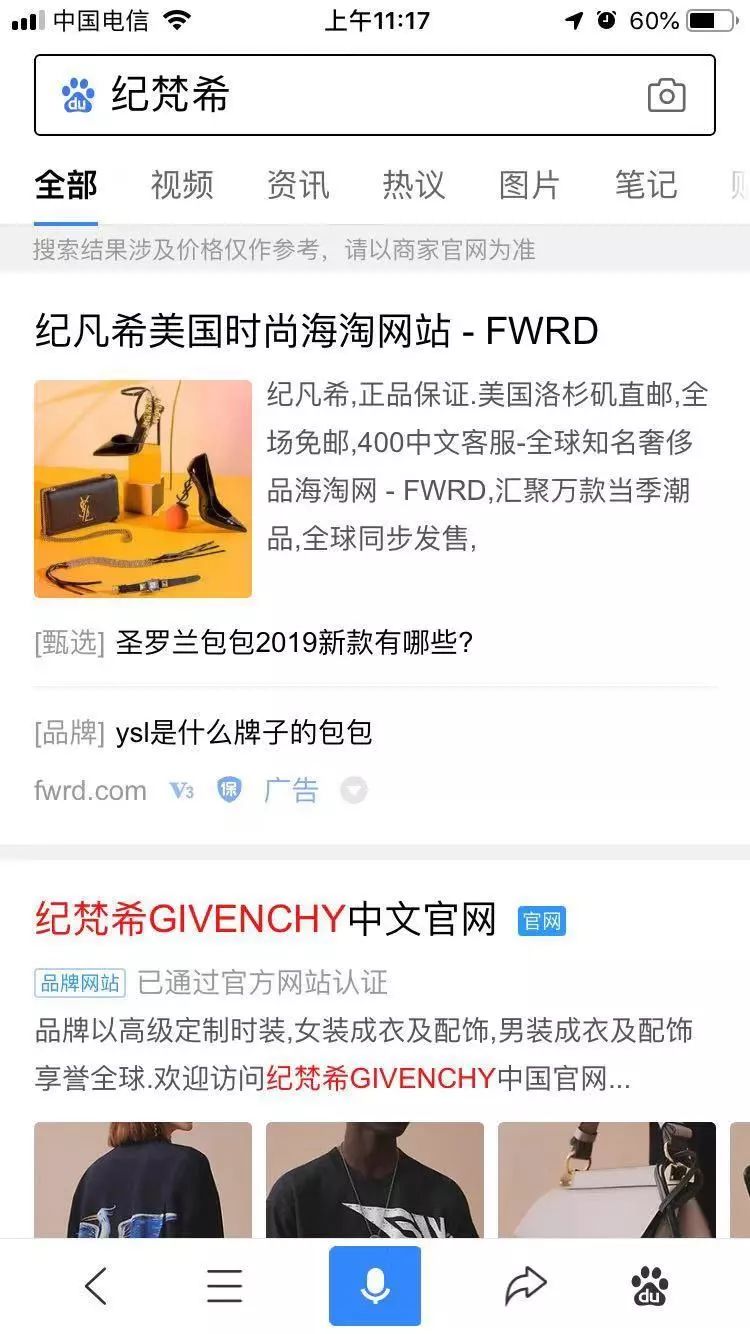 小线菌重复试验头条搜索的步骤,在搜索框搜索「纪梵希」,得到的首页的第一条是广告,而后是官网,关键词也被标红。