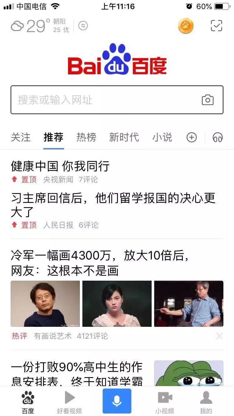 百度搜索的首页分为两部分,搜索框+信息流推荐内容。