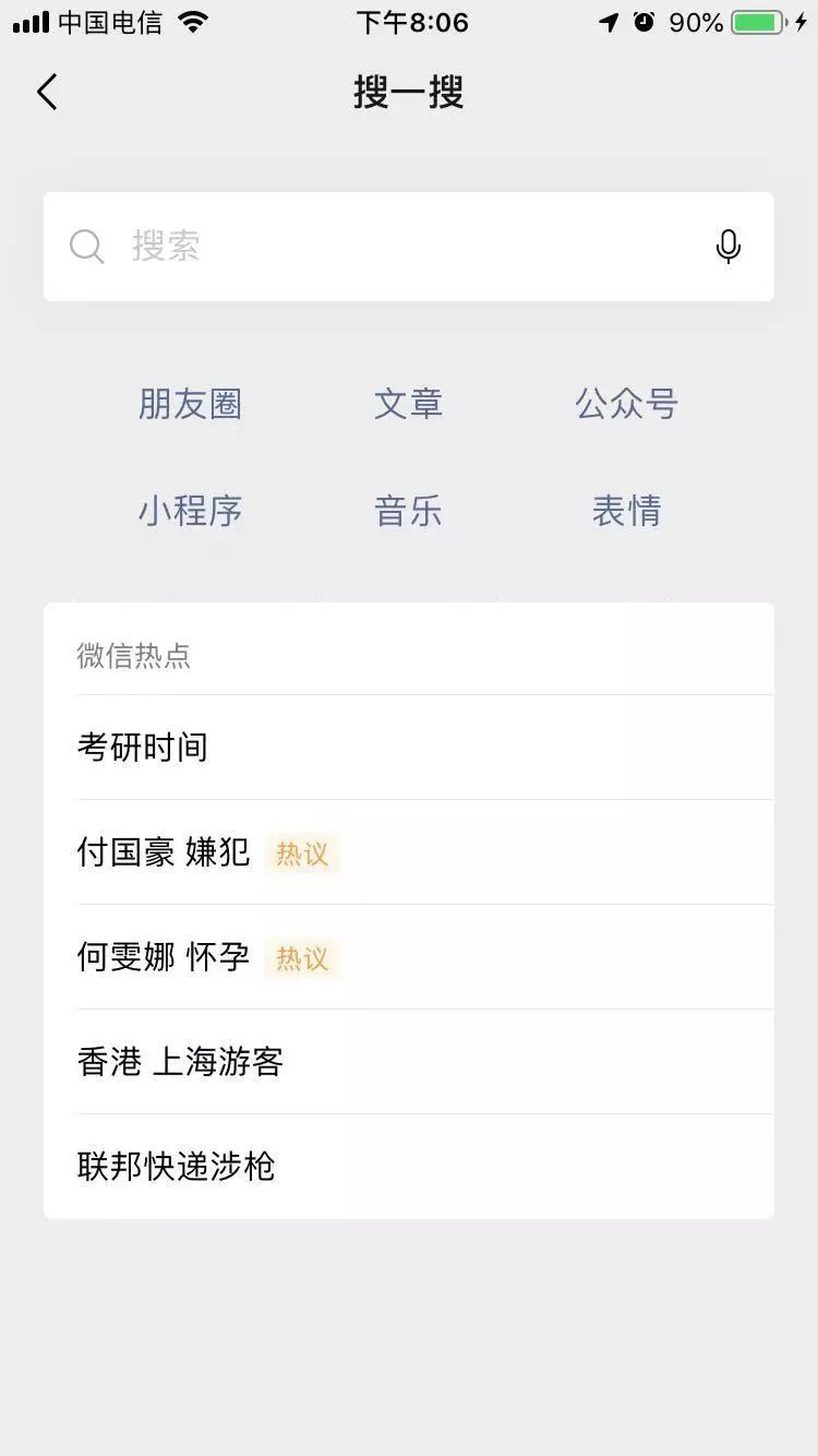 第二个入口在「发现」的tab内,有一个「搜一搜」,点击进入,则会出现下方第三张图的界面。