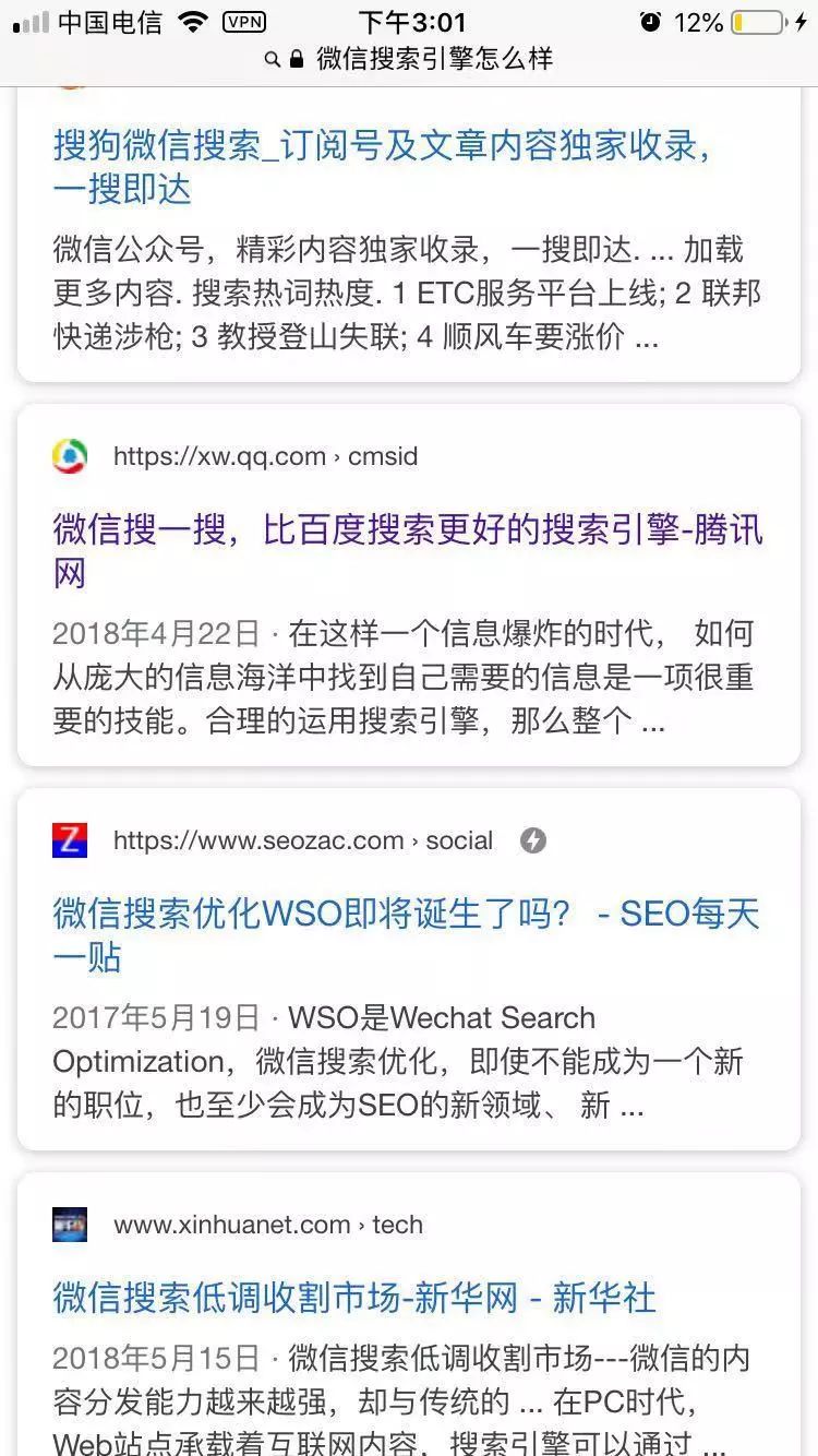 搜出的内容,前几条是公众号的文章,后面有一些微信小程序、视频相关的内容,无广告,搜索结果都来自于微信以及其他腾讯的内容,这些内容的质量较高,排列在前面的都是阅读量较高的文章,或者朋友看过的文章。