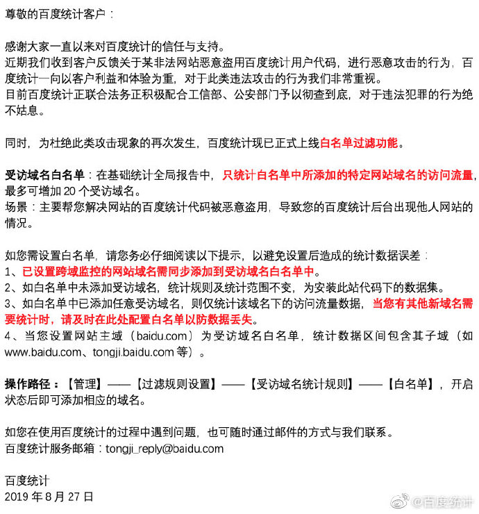声明称,目前百度统计正联合法务正积极配合工信部、公安部门予以彻查到底,对于违法犯罪的行为绝不姑息。同时,为杜绝此类攻击现象的再次发生,百度统计现已正式上线白名单过滤功能。即在基础统计全局报告中,只统计白名单中所添加的特定网站域名的访问流量,最多可增加20个受访域名。