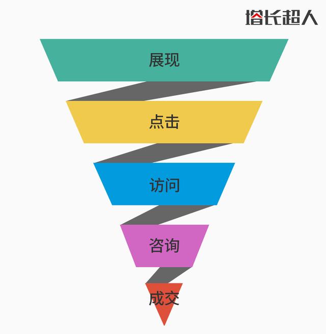 营销漏斗模型全称为"搜索营销效果转化漏斗",漏斗的五层对应了企业搜索营销的各个环节,反映了从展现、点击、访问、咨询,直到生成订单过程中的客户数量及流失。从最大的展现量到最小的订单量,这个一层层缩小的过程表示不断有客户因为各种原因离开,对企业失去兴趣或放弃购买。