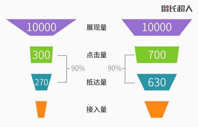 我们来看看这两个营销漏斗,左边的点击率低,导致点击量基数较少,即使下一环节抵达的转化率与右边的相同,但抵达量也是千差地别。