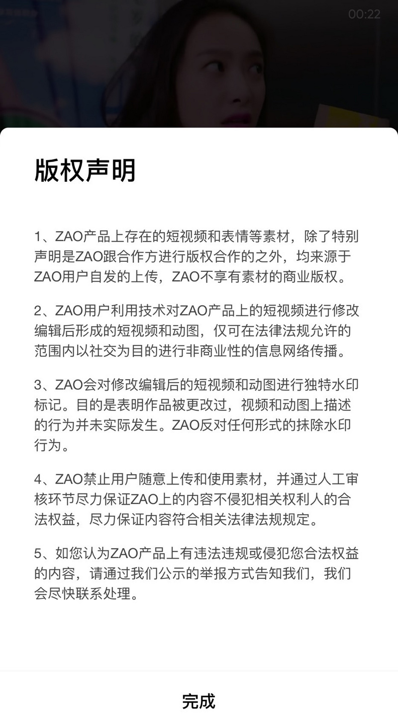 点进ZAO的素材使用页,在版权声明中,ZAO写道:“短视频和表情素材,除了特别声明是ZAO跟合作方进行版权合作的之外,均来自于用户自发的上传,ZAO不享有素材的商业版权。”