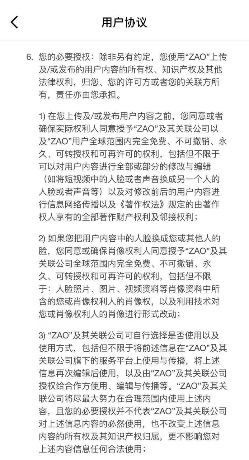 问题还是出在这张脸上。想要跟上潮流玩换脸游戏,你必须同意ZAO默认的用户协议,即“同意或者确保肖像权利人同意授予‘ZAO'及其关联公司全球范围内完全免费、不可撤销、永久、可转授权和可再许可的权利。 ” 是的,这基本意味着你一旦上传自己的换脸视频之后,就无法再删除里面的照片,哪怕删除应用也不行。