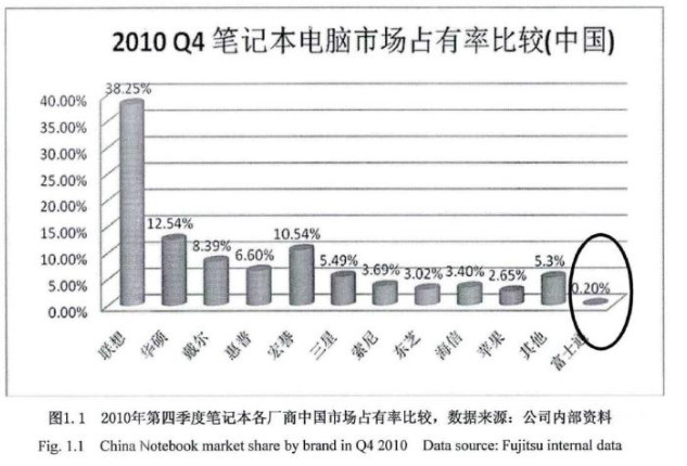 但是,高端产品终究没能适应全球PC发展。富士通成本居高不下,难以在价格竞争上获得优势。随着国产品牌的崛起和美系品牌的双重压力下,其市场份额每况愈下。以在中国为例,2010年富士通在中国的市场份额已是少的可怜,更别谈竞争白热化的今天。
