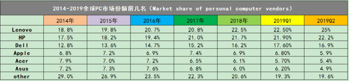 那么有哪几个?联想、惠普、宏碁、华硕、戴尔、苹果和其他。市场占有率的高低,自然需要数据作为支撑。于是,我在网上搜索了:Marketshareofpersonalcomputervendors(个人电脑厂商的市场份额),参考了搜索到的两个网站数据作为参考,做出了下图。其一是Statista,它是德国的在线统计网站,被称为世界上最成功的统计数据库之一。其二是维基百科,参考意义不言而喻。