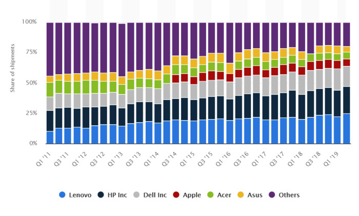 8月中旬,联想公布了2019财年Q1财报,称其PC市场份额达24.9%,位居全球第一。关于市场占有率的问题,网络上有很多种算法,由于各种原因,数据可能会有所偏差。但是,主要占据市场的笔记本电脑就那几个,闭着眼也许你也能想到。