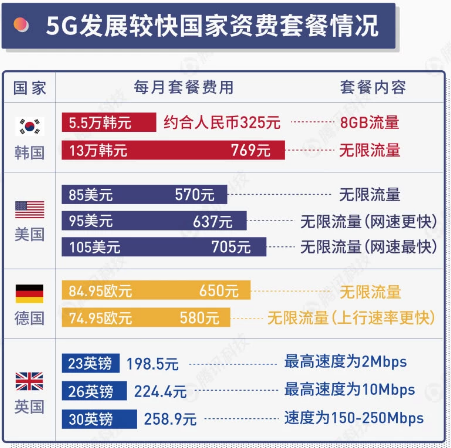 韩国虽然是全球首个开始大规模商用5G的国家,用户数已经达到了上百万,但是在韩国,则是依靠运营商大额补贴5G手机才能进一步推动5G发展。三星Galaxy 10 5G版面世后售价为 1397000 韩元(约合人民币8236元),最新推出的Note 10系列在韩国的售价也并不低,Note 10 5G版为1248500韩元(约合人民币7353元),Note 10+ 5G版为 1,397,000韩元起(约合人民币8236元)。价格最便宜的LG V50 ThinQ 5G版售价也是达到了1199000韩元(约合人民币7069元)起售。由于售价较高,韩国运营商也是对手机进行了补贴,有些机型补贴甚至达到了一半以上,以此来促使用户购买5G手机产品。而韩国的5G套餐最低价格达到了55000韩元,约合人民币300多元。这样算下来虽然手机确实便宜了,但昂贵的5G套餐费用则将此前的补贴慢慢又拿了回来,说到底也就是将一次性的高额用机成本变成了后续的持续消费。