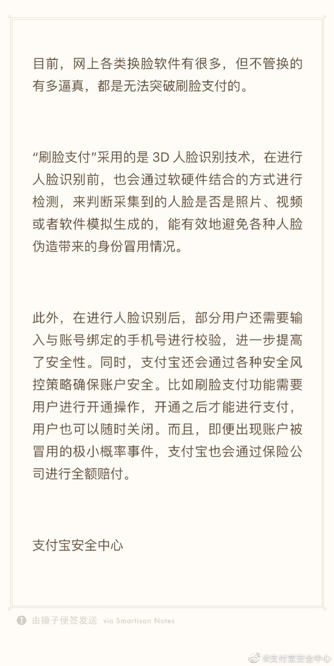 支付宝安全中心表示,目前,网上各类换脸软件有很多,但不管换的有多逼真,都是无法突破刷脸支付的。刷脸支付”采用的是3D人脸识别技术,在进行人脸识别前,也会通过软硬件结合的方式进行检测,来判断采集到的人脸是否是照片、视频或者软件模拟生成的,能有效地避免各种人脸伪造带来的身份冒用情况。