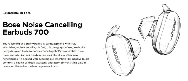 Bose Earbuds 700另一款Bose Earbuds 700上则明确宣布了其具有降噪功能,Bose声称其具备“可与其最强的头戴式耳机相媲美的降噪功能”。这款产品同样支持触摸控制和智能语音助手。除上述信息外,Bose并没有提供任何其它规格以及价格或具体的发售时间,只告诉这两款产品会在2020年面世。