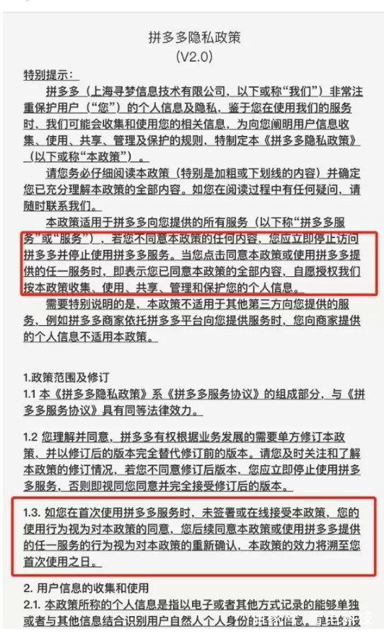 也就是说,拼多多在用户毫不知情的情况下,就强迫用户与拼多多签署了一份协议,这份协议授权拼多多随意收集用户隐私信息。只要你用了拼多多就代表同意,不签协议也算同意。