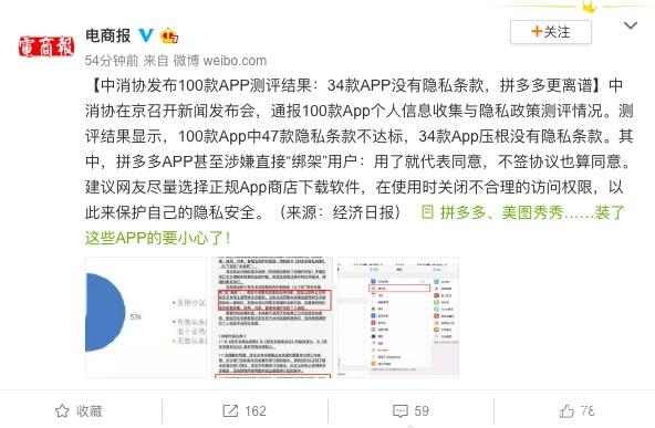 根据抽查结果,近一半APP隐私条款内容不达标,34款APP甚至没有隐私条款,而当时刚刚成功在美国上市的拼多多在侵犯用户隐私方面则是更加离谱。
