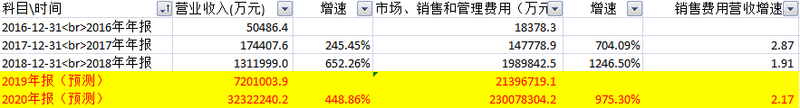 如果保持448.86%的营收增长和975.30%的销售费用增速,2019年营收可以达到720亿,销售费用则达到2139亿,到2020年营收可以达到3232亿,销售费用则达到2.3万亿。