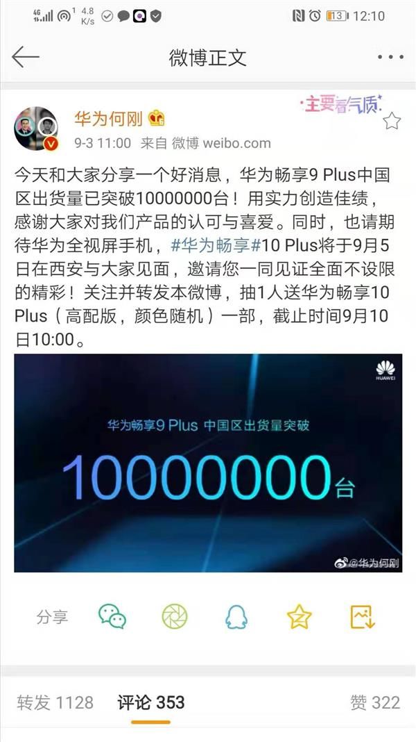 就在今天,华为终端手机产品线总裁何刚在微博上发布了一条喜讯:“ 截止9月,华为畅享9 Plus销售突破10000000台 ,感谢花粉支持,感谢用户信任,还有感谢所有渠道的销售人员贡献,用实力说话,不管高端还是千元机,都是华为最高品质!”犀利的言语间仿佛在告诉我们,华为畅享10 Plus将会成为下一个千万销量王。