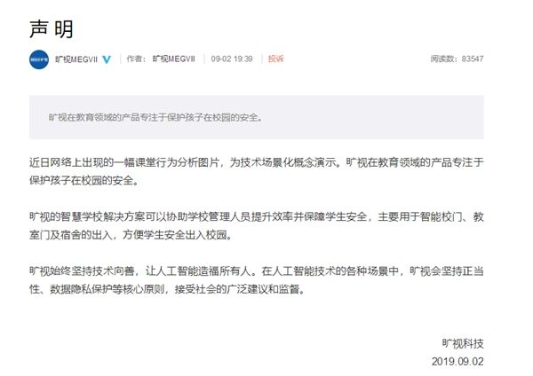 而开发该系统的正是AI独角兽公司旷视科技。对此,旷视科技在其官方微博发布声明。声明称, 网络上出现的课堂行为分析图片,为技术场景化概念演示。